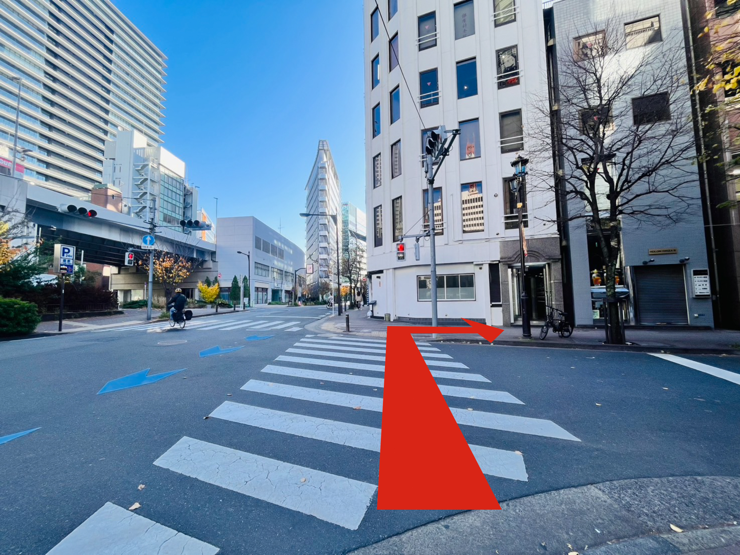 銀座INZ2とINZ3の間、高架をくぐりますと交差点にさしかかりますので、渡りまして奥の歩道