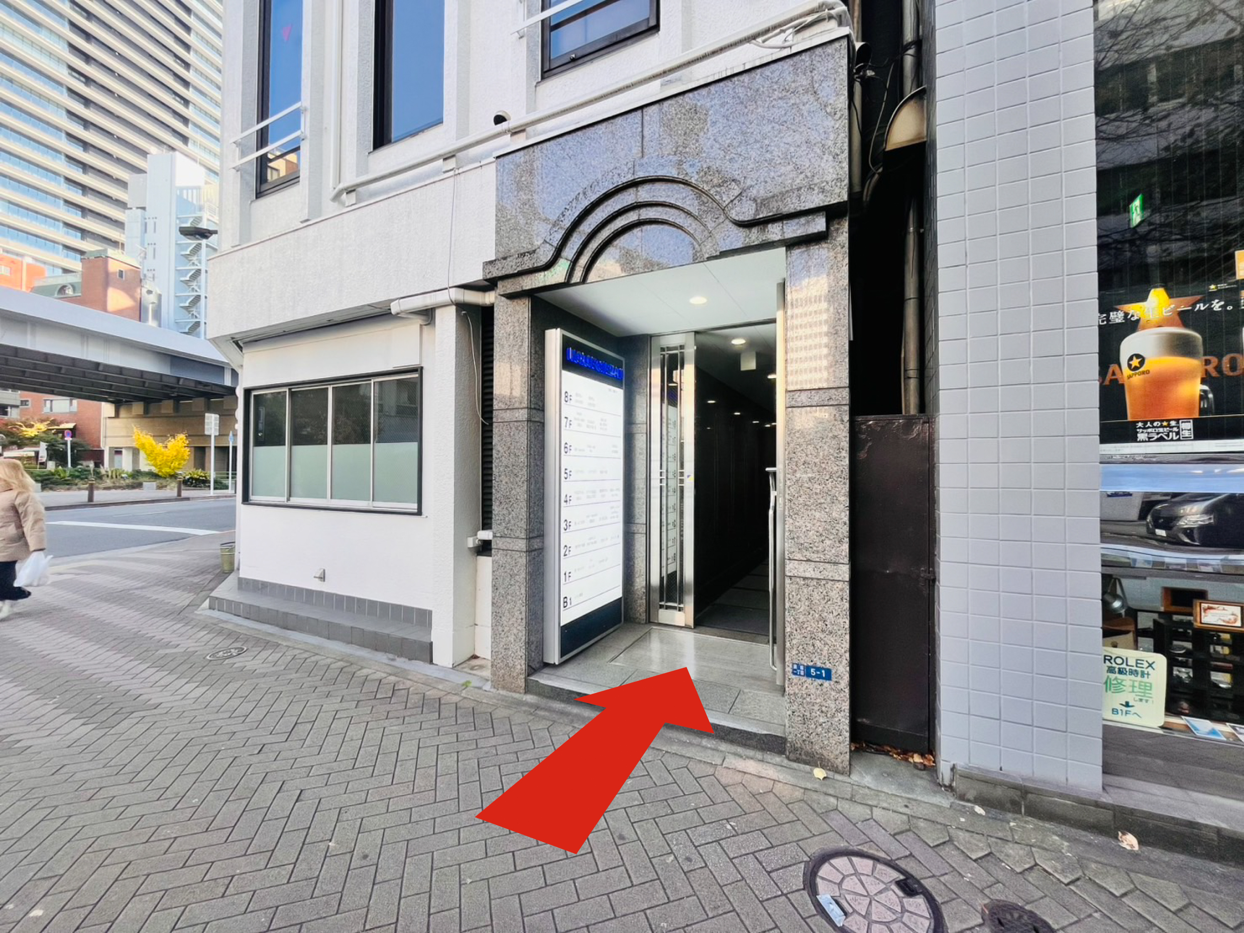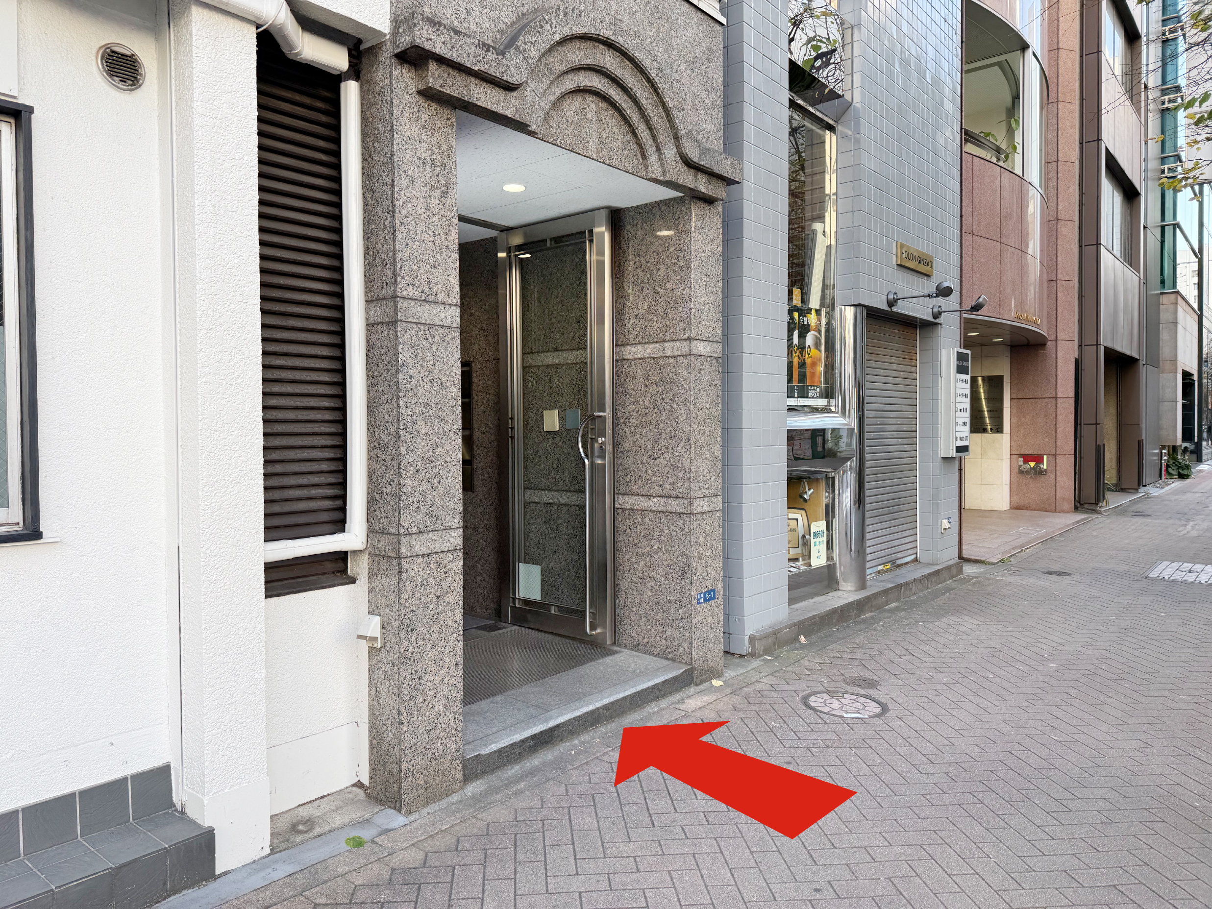 丁字路にさしかかります。角の建物の入口がございますのでこちらから入ります。4階に当店が